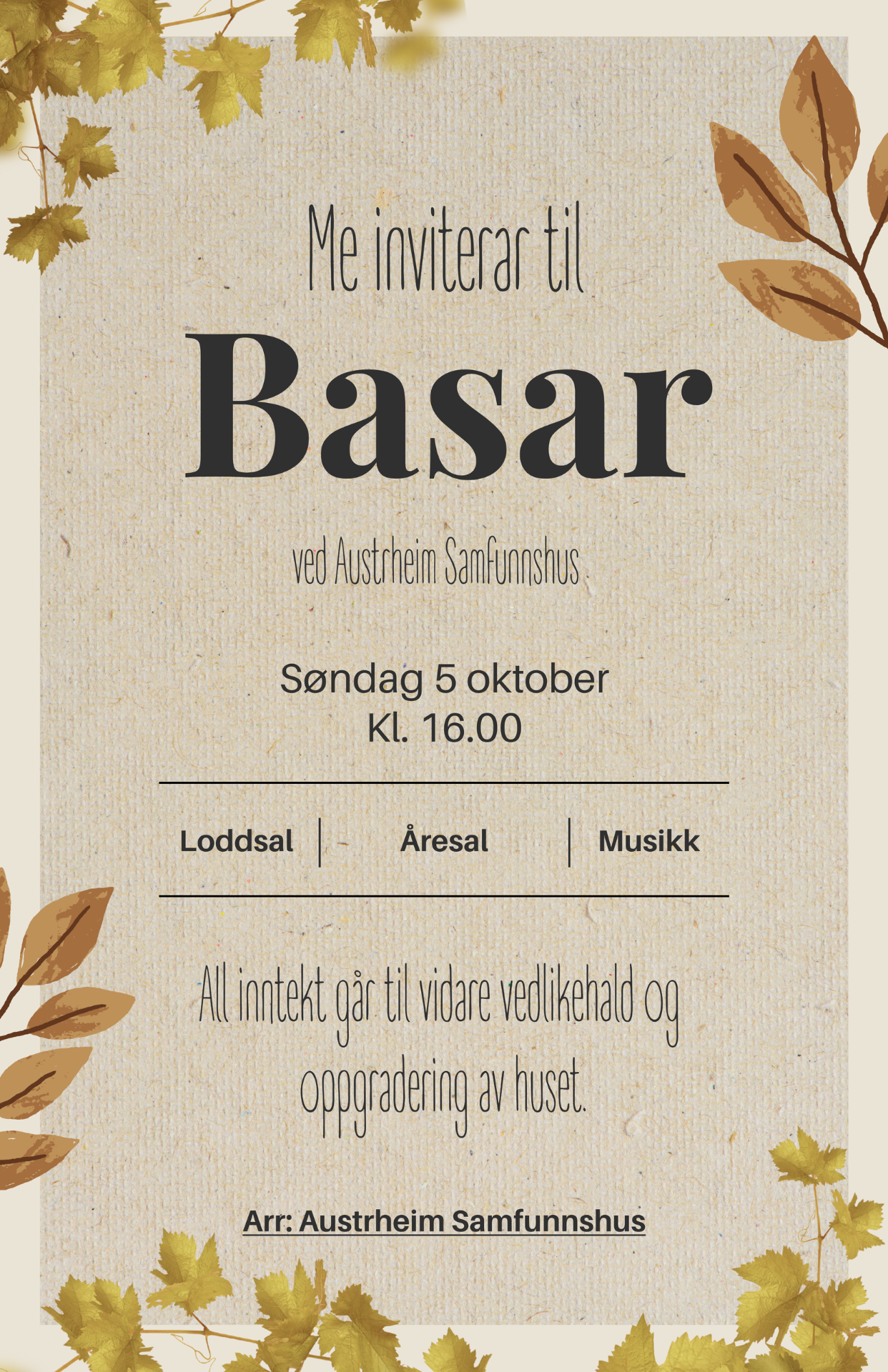 Basar ved Austrheim Samfunnshus. Søndag 5 oktober kl. 16:00.